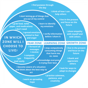 Growth – We cannot control what is happening in the outside world, but we can choose how to respond to what is happening in our lives. You can learn to move beyond the fear zone to the learning and growth zones. Click on the image above and choose one example each day from the diagram to practice. For example, “Today, I will identify my emotions” or “Today, I will show empathy to myself and others”.